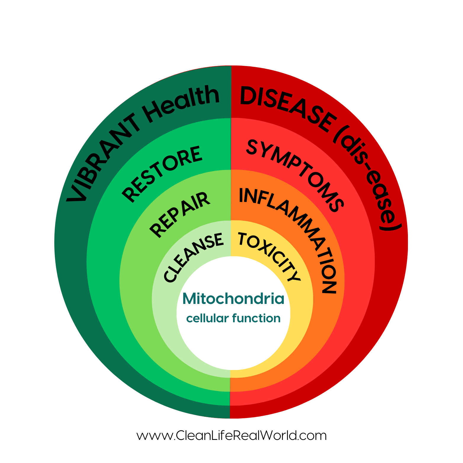 DISEASE → CLEANSE Toxicity → REPAIR Mitochondria → RESTORE Function → VIBRANT HEALTH
